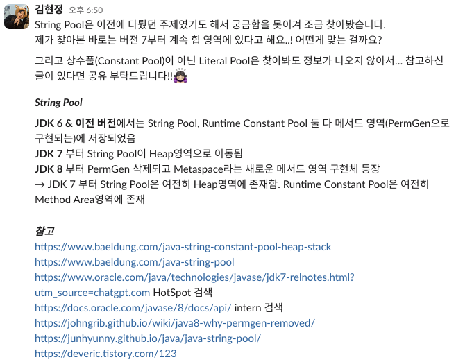 그러다 그룹 스터디 때 다른 분의 발표 중 질문으로 String Pool과 관련된 얘기가 잠깐 나왔었다. 이후에 따로 몇 분께서 답을 찾아 슬랙에 보내주셨는데, 내 첫 발표 주제(발표 내용 링크) String은 왜 대문자일까와 겹치기도 하고 정든(?) 분야라 더 확실히 하고싶어서 정말 오랜만에 GPT 없이 오로지 공식 문서만을 보고 정보를 찾아봤다. 테크블로그는 출처가 남겨진 블로그를 위주로 정보를 얻었다.