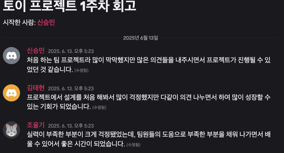 부족했던 부분은 팀원들의 피드백을 통해 보완하며 함께 성장할 수 있어 의미 있는 한 주였습니다.토이프로젝트1이 끝났다.