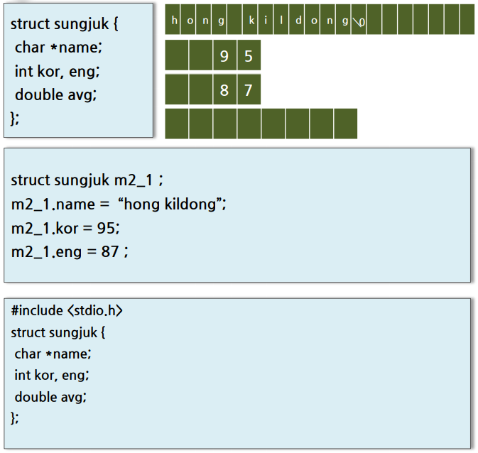 struct sungjuk { char name[20]; int kor, eng; double avg; }; struct sungjuk m[50]; // 50명 학생의 성적을 처리구조체 포인터