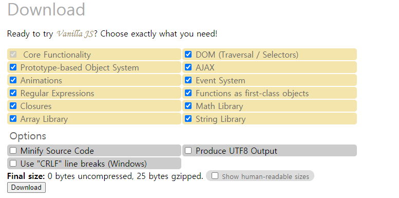 그래야 각종 바닐라JS를 원하는대로 꾸밀 수 있으니까요. 그리고 또 원하는걸 고를 수 있습니다. 다 하고 싶다고 가정하고, 몽땅 골라보겠습니다.