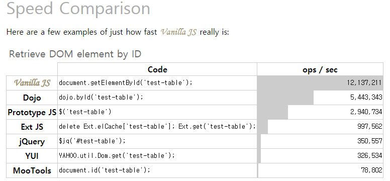 여기 보이는 것처럼 일반 JavaScript가 다른 것들에 비해 엄청 빠릅니다. 120만개가 넘는 Operation을 1초에 할 수 있죠.