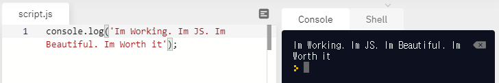 사진과 같이 alert를 console.log로 바꿔주면 제대로 실행이 되면서 아까는 경고메세지로 뜨던 내용이 여기 console에 뜹니다. 좋아요 여기 보이는 것처럼 HTML CSS에 JavaScript 파일을 추가하는건 매우 쉽고 심플합니다. 심플한 이유는 전에 말했듯이 모든 웹브라우져에는 JavaScript가 설치되어있기 때문입니다.