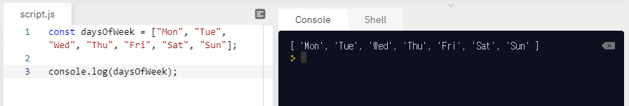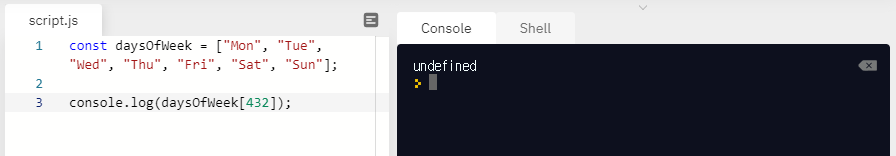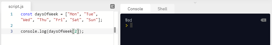 이렇게 하면 됩니다. daysOfWeek[2] 그리고 실행하면 3번째에 저장된 요일인 Wed가 나옵니다.