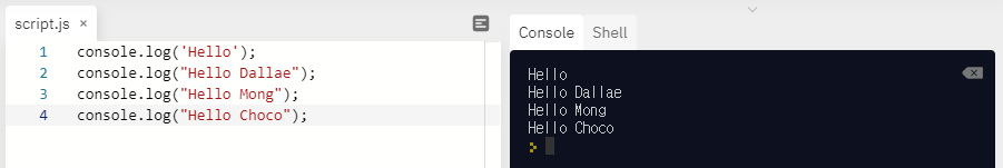 log도 함수인데 console object 안에 있는 함수라는 뜻입니다. console.log는 안에 메세지가 없이는 동작하지 않아요! 그래서 console.log("Hi"); Hi라는 메세지를 넣었습니다. Hello / Hi라고 나오네요. 즉 console.()에 뭐든 넣고 싶은 것을 두 개의 따옴표 사이에 넣으면 함수는 그걸 사용합니다.