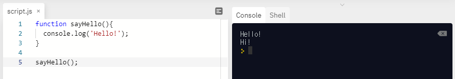 그럼 sayHello();는 Hello라고 나옵니다. 이게 여러분의 첫 함수입니다!!! 축하햄!🎈