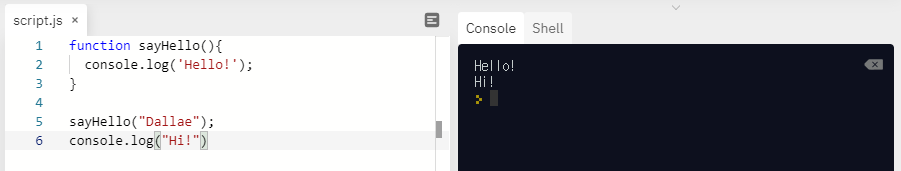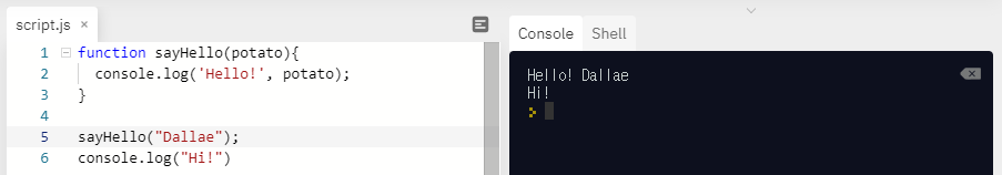 그런데 () 사이에 "Dallae"를 넣었는데 왜 Hello Dallae라고 나오지 않는 걸까요? 뭐든 () 안에 적으면 함수가 그걸 사용하게 된다고 했는데 말이에요. 왜 안될거 같나요? 잠시 생각해봐요.