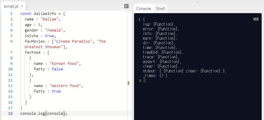 console은 Object입니다. dallaeinfo가 Object 인 것 같이 .log는 자바스크립트 안에 있는 것들을 말합니다. 이 컴퓨터 소프트웨어에 console이라는 object가 있고 log라는 키가 있는거죠.이 경우에는 log는 function(함수)인거예요. 근데 object지요. 그렇다면 오브젝트를 console.log로 찍어 보면 어떨까요?